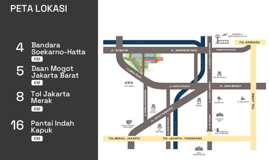 Gudang Duta Indah Sentoha terletak di Jalan Muhammad Toha dekat perumahan Duta Indah Residence. Hanya berjarak 4 Km dari Bandara Soekarno-Hatta dan 8 Km ke Tol Jakarta-Merak.